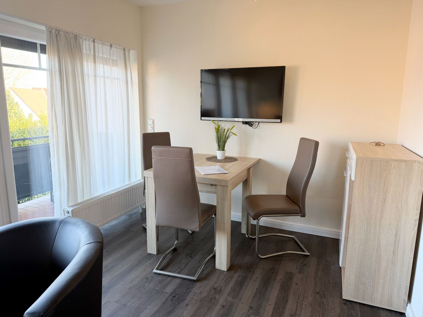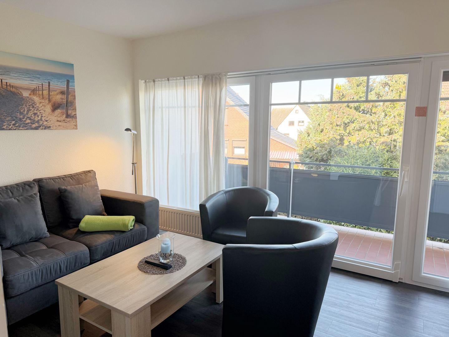 Für die schönste Zeit des Jahres. Geschmackvoll und komfortabel eingerichtet befindet sich die Wohnung im 1 OG. Neubauflair mit einer ruhigen Lage für eine entspannte Auszeit und Erholung. Im Wohnzimmer befindet sich eine gemütliche Sitzecke und eine Couchgarnitur aus Leder sowie ein großer Flachbildfernseher. Der möblierte Balkon erschließt sich über die gesamte Wohn-/Esszimmerbreite zur Westseite. Hier können Sie die Nachmittag- und Abendsonne genießen. Im Kinderzimmer steht ein solides Etagenbett, welches auch für Erwachsene geeignet ist. Das Elternschlafzimmer verfügt über ein modernes Doppelbett mit Schränken. WC mit Handwaschbecken und modernes Duschbad sind voneinander getrennt. Besonderheiten: abschließbare Fahrrad-Garage, W-LAN, elektrische Außenrollläden, Bollerwagen. Zur Wohnung gehört ein Außenstellplatz direkt am Haus.