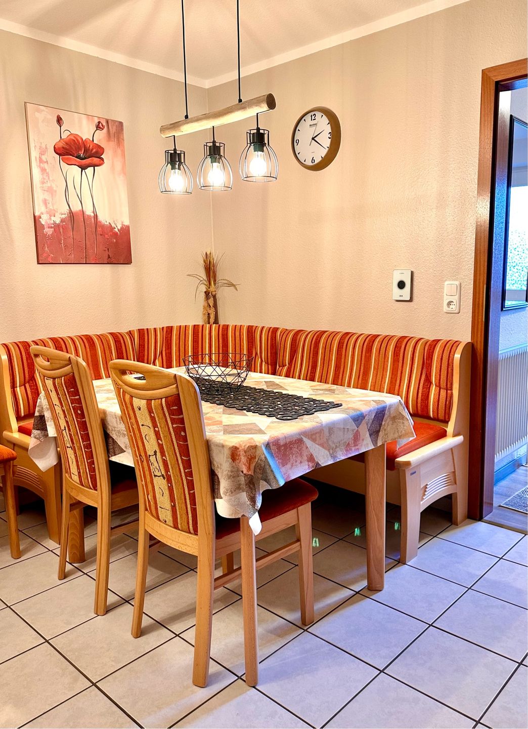 Hier mieten Sie ein tolles Reihenhaus in der Langen Wiese, nur wenige Minuten vom Strand entfernt. Das Haus hat im Erdgeschoss ein Wohn- / Esszimmer mit Zugang zur eingezäunten Terrasse, eine separate komplett ausgestattete Küche und ein Gäste-WC. Im 1.OG befindet sich das Duschbad, ein Schlafzimmer mit Doppelbett ( 90x200 cm) und Zugang zum kleinen Balkon. Das zweite Schlafzimmer ist ein Durchgangszimmer mit zwei Einzelbetten (90x190 cm) . Von hier gelangen Sie ins Dachgeschoss, wo sich das dritte Schlafzimmer mit einem Doppelbett (90x200 cm) befindet. Dieses Reihenmittelhaus liegt in strandnaher Lage und der PKW-Stellplatz befindet sich direkt vor dem Haus. Auch eine größere Familie findet hier ausreichend Schlafmöglichkeiten. Bis zu zwei liebgewonnene Vierbeiner dürfen Sie hier gerne begleiten! Außenrollläden sorgen für Schlafkomfort.